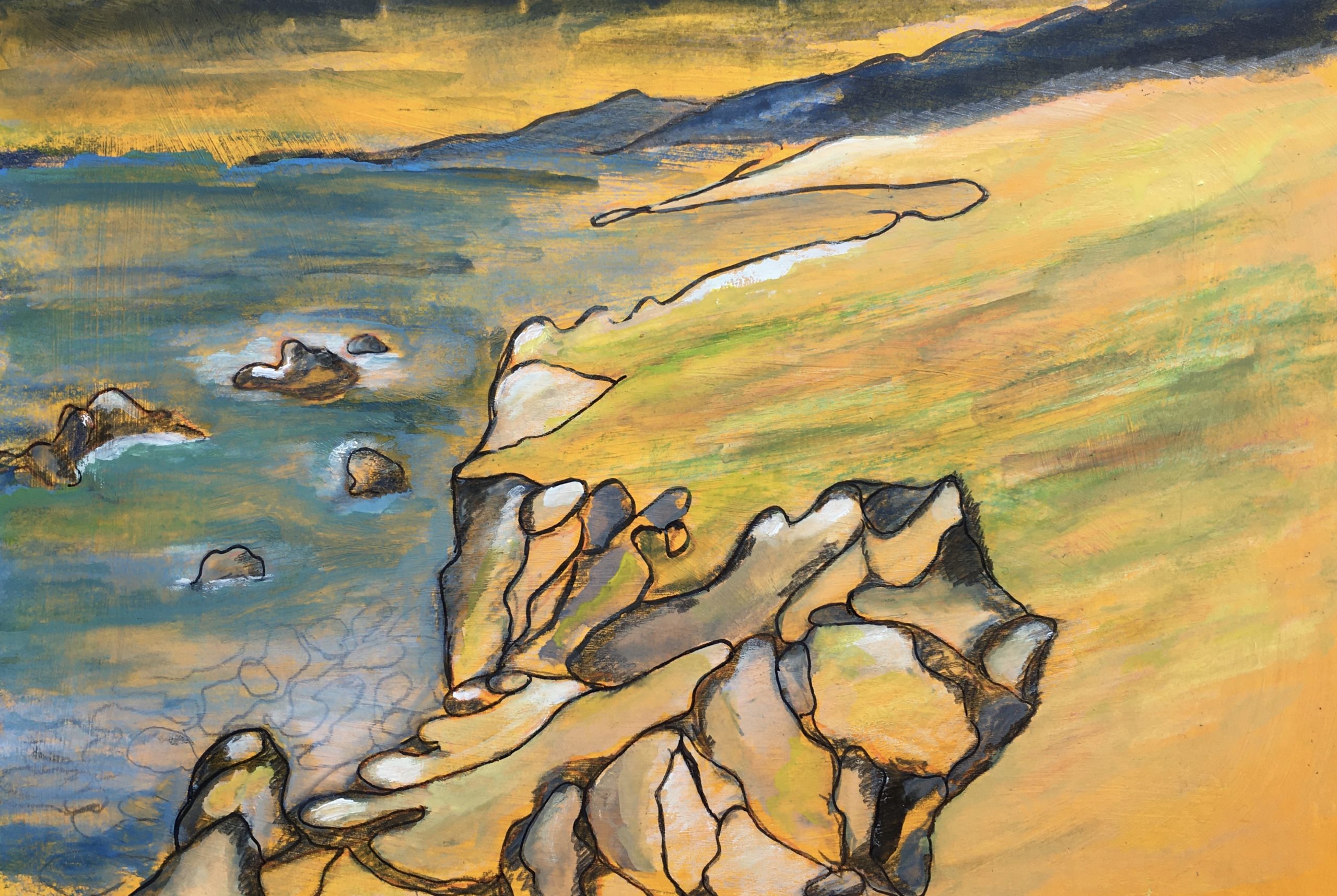 Am Abend zeichne ich oft noch am Küchentisch. Es entstehen aus von mir gesammelten Papierschnipseln Collagen, die ich durch Zeichnungen und Farbflächen ergänze, meist über mehrere Tage. Oft sehe ich mir morgens dann das Ergebnis an und mir fällt dann ein, was ich noch verändere oder ergänze am Abend. Es ist immer ein Prozess und oft erzählt das Bild dann eine Geschichte.